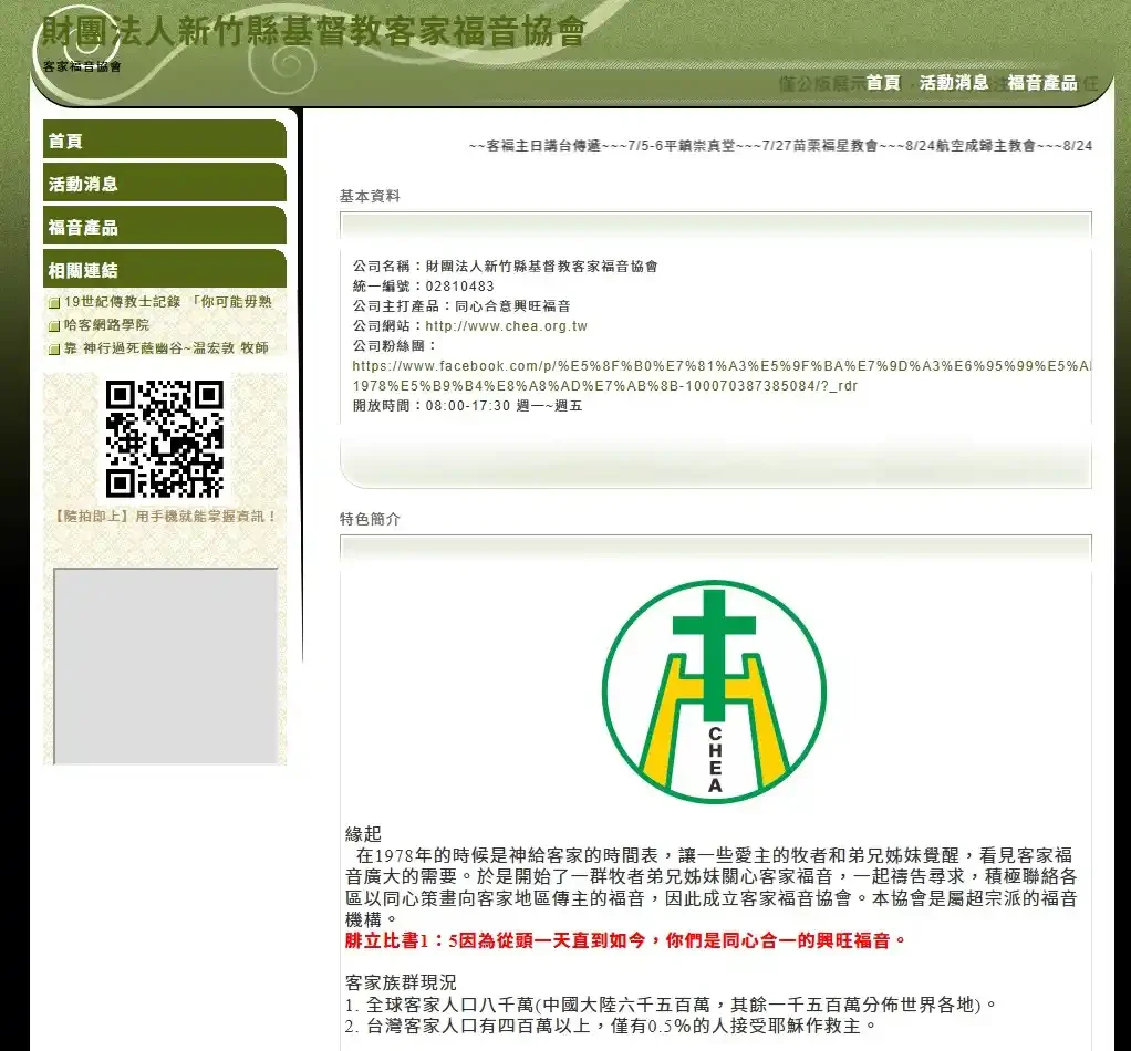個人也是正宗客家子弟(信主近三十年、網頁設計資歷逾十六年),在設計客家人的網站,更是特別有感,先後完成的有竹南崇真堂、台灣基層福音差傳會、台灣崇真會、台灣華人宣教動員協會,再來就是本文所提的客家福音協會網站,在在看出客家人信主的不易,以及早期客家牧者的創業維艱,真的太辛苦了!